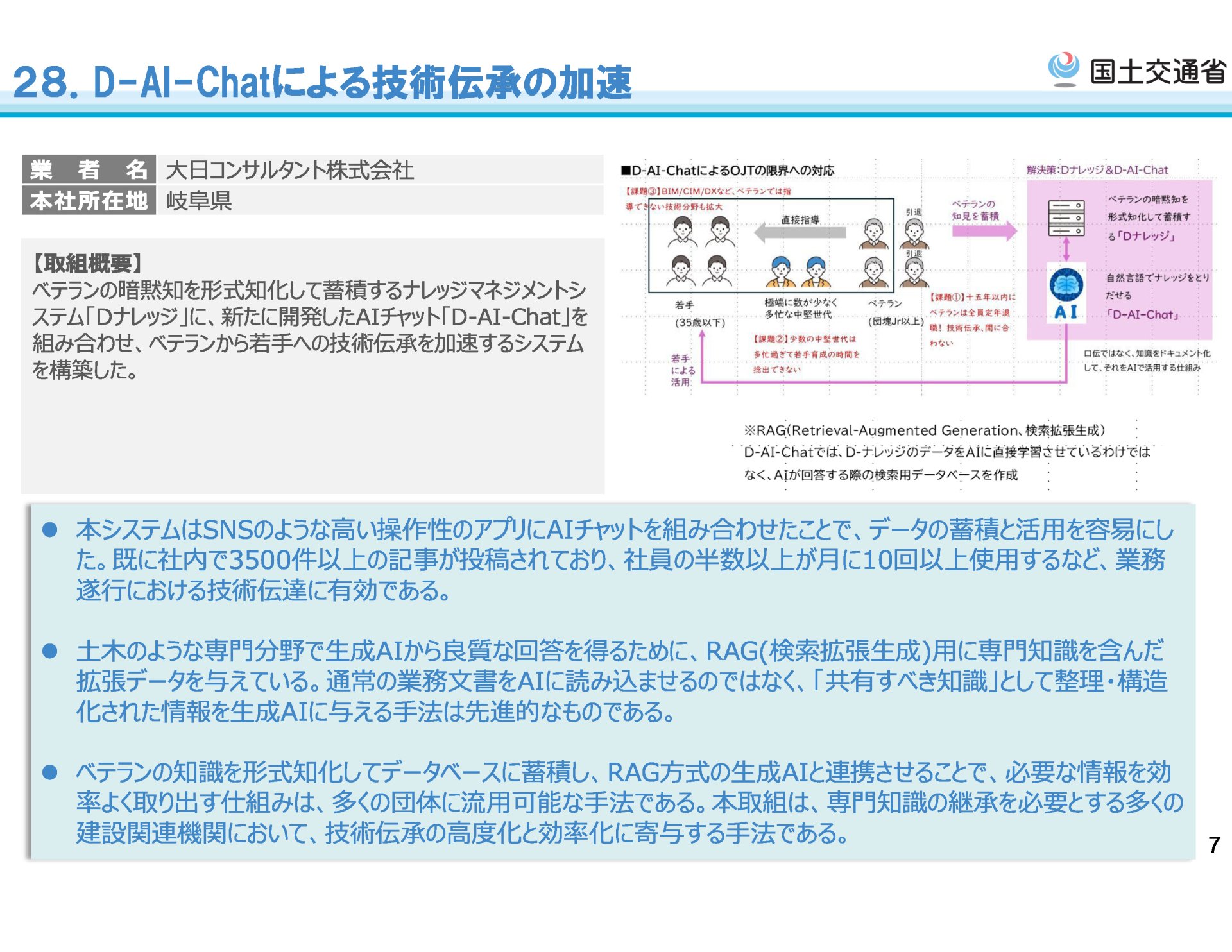 また、ベテランの知識をデータベース化し、RAG方式の生成AIと連携させることで、専門知識を効率的に活用・継承できる汎用性の高い手法であり、建設関連機関における技術伝承の高度化と効率化に寄与する取組です。